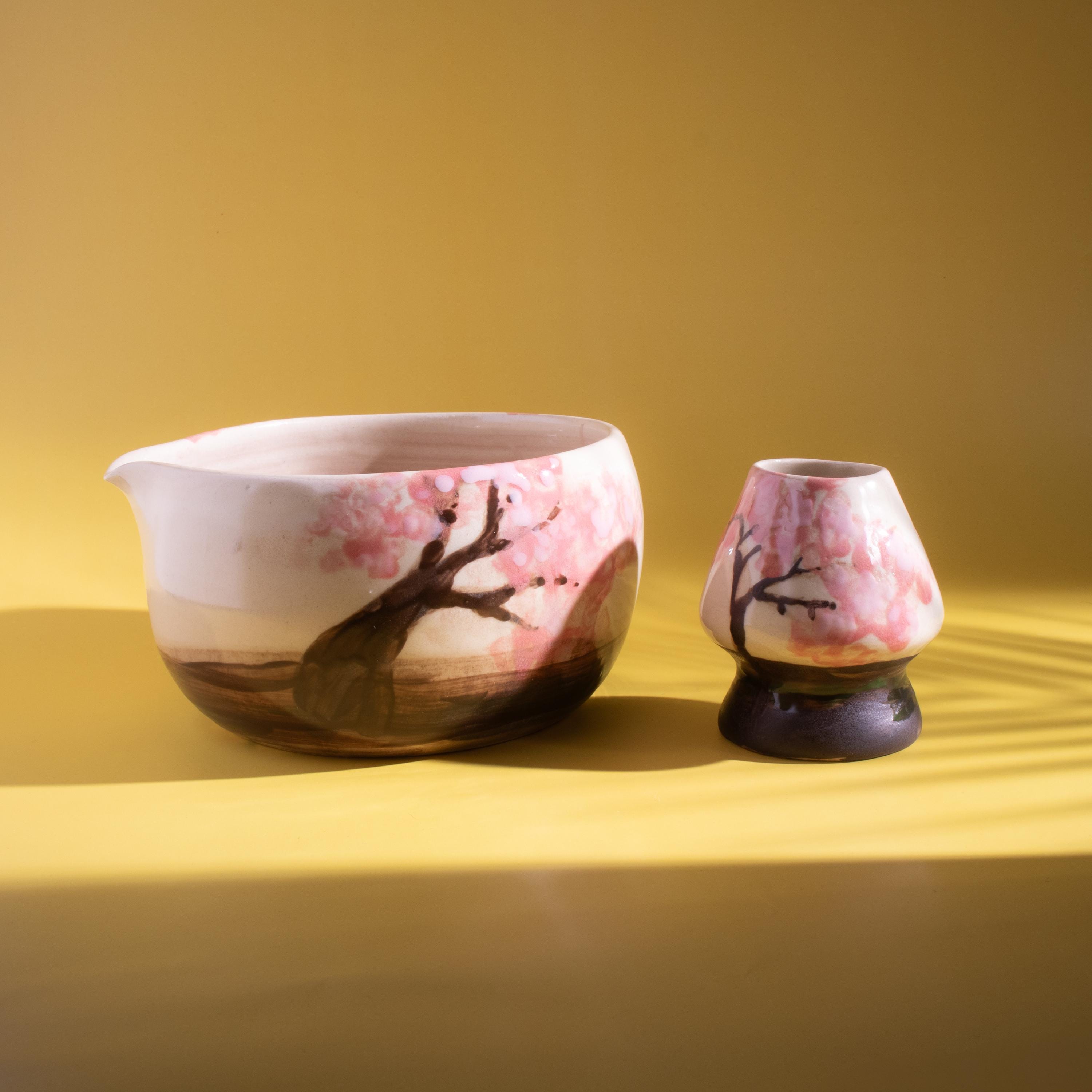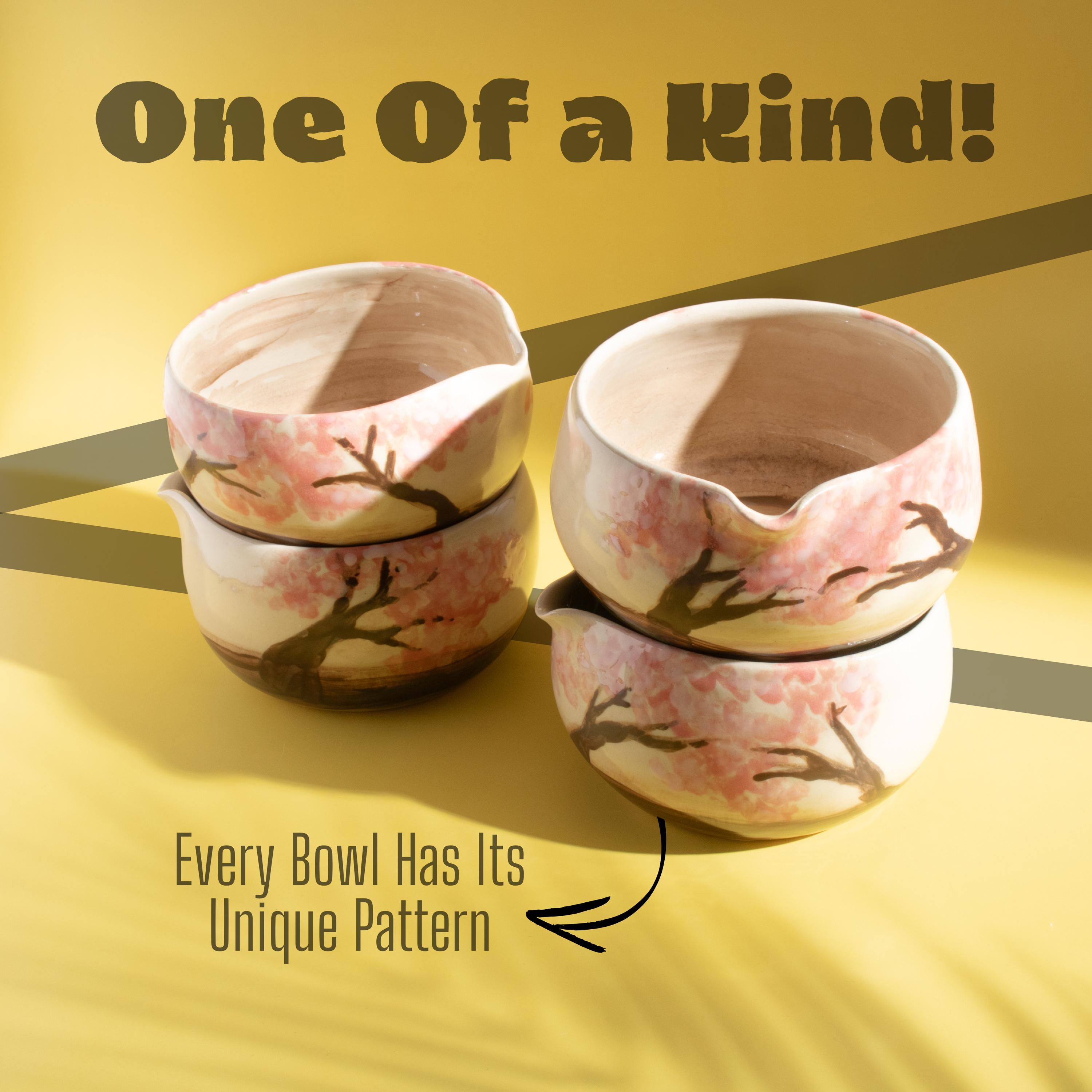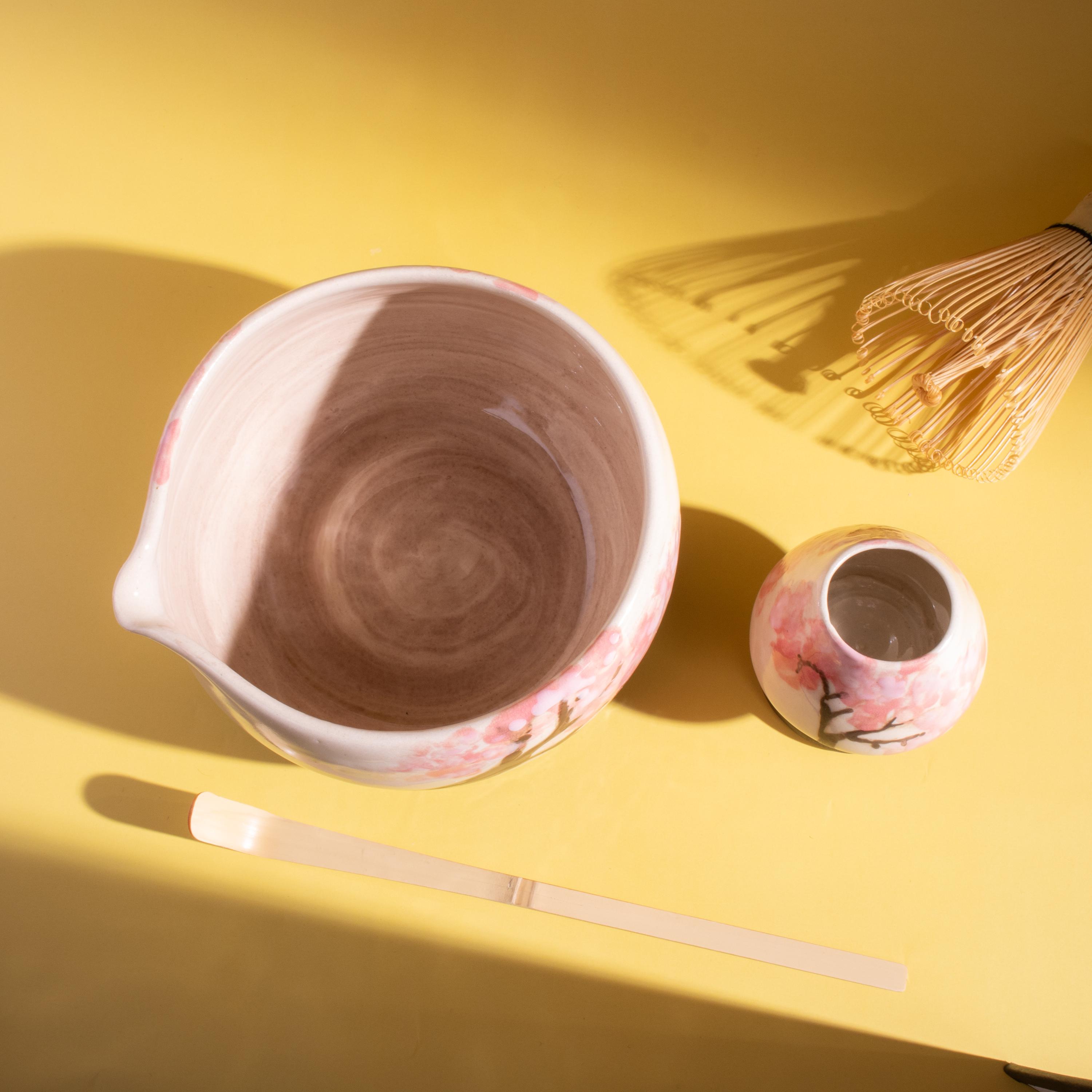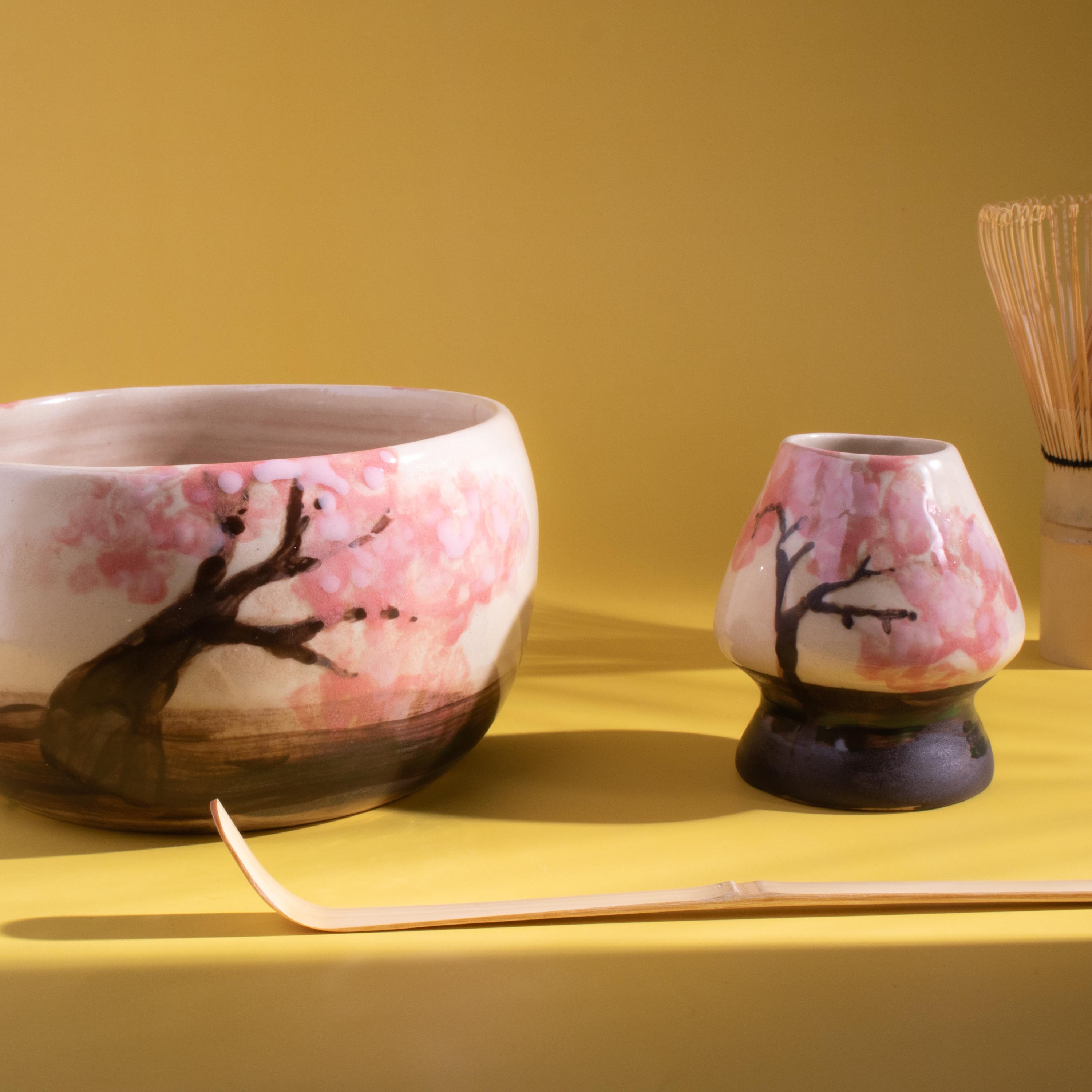 Highlights 🌸 Hand-painted Cherry Blossom design — each piece is unique 🔥 Fired at 1200°C (2192°F) for lasting durability 🍵 Includes a handmade bowl and matching whisk holder 🖐️ Wheel-thrown using traditional pottery techniques 🎁 Perfect for tea lovers, art collectors, and handmade gift seekers