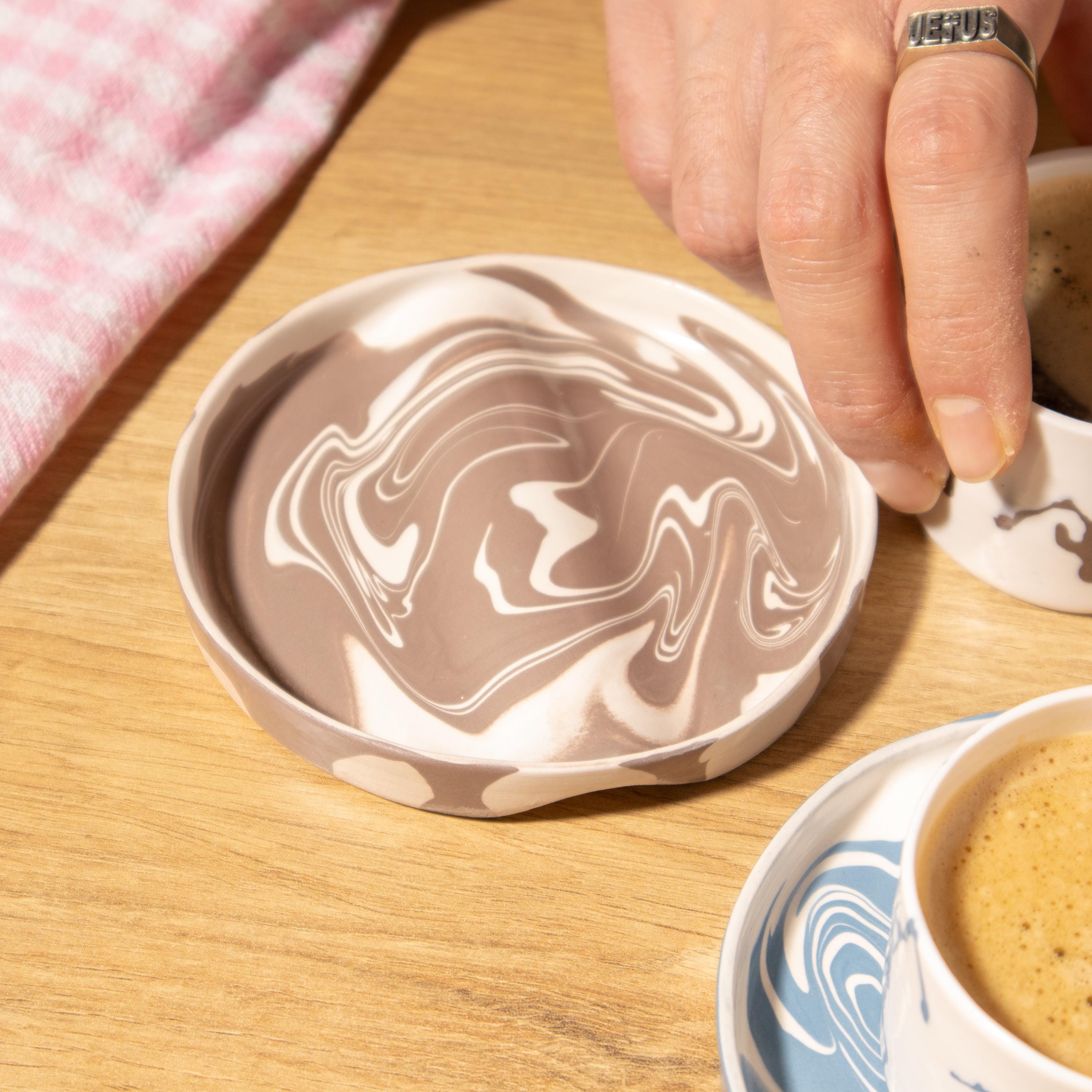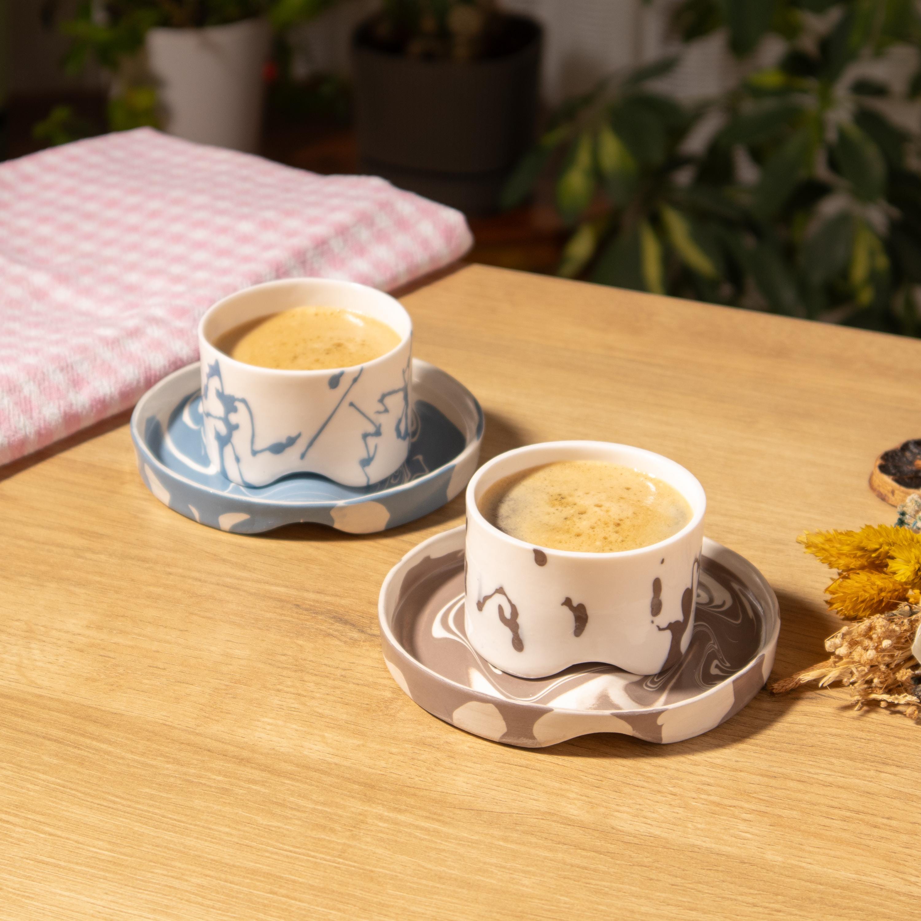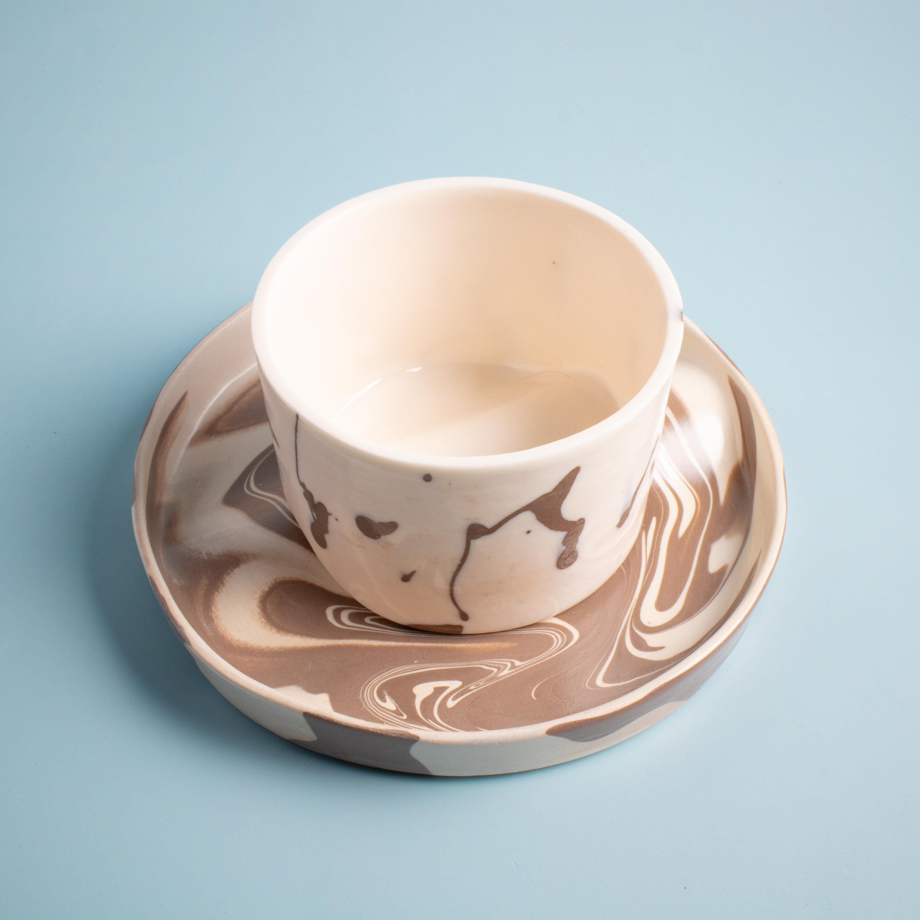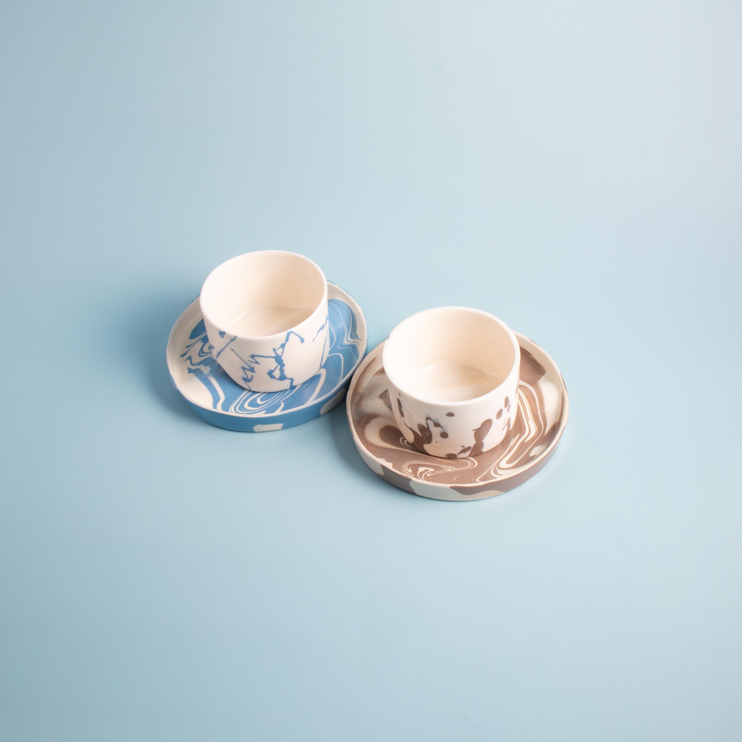 This espresso cup and saucer set is handmade in our small studio using translucent porcelain clay, known for its extra-thin yet durable structure. A second layer of colored porcelain is applied by hand to create soft, flowing patterns, while the saucer features a natural marble-like surface. Each set is one of a kind.
